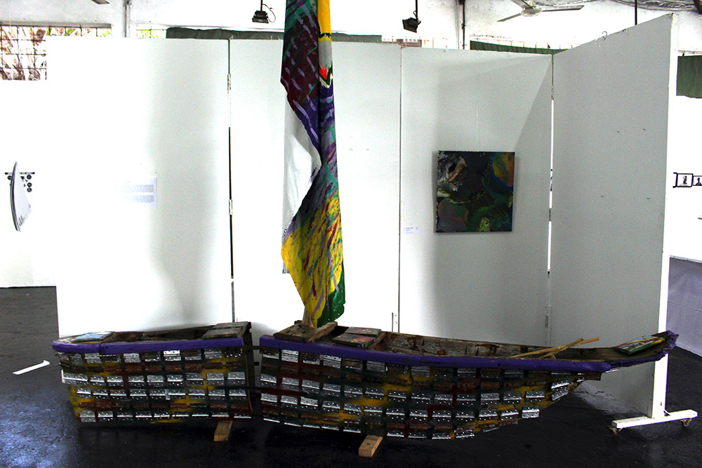 Daniel Clarke Fractor Door Hinges,Spray Paint and Acrylic On Boat,Barbed Wire,Paint,Canvas, Sail On Bamboo 350cm x 60cm Donation
