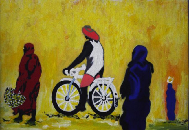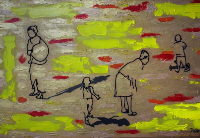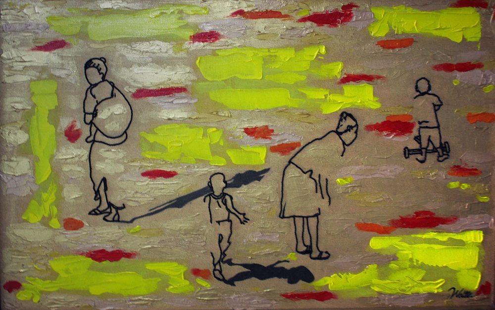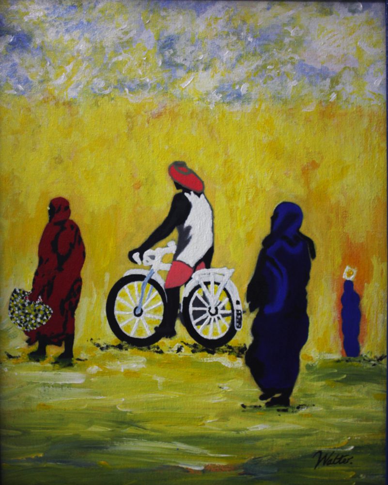 Walter Simbo Urassa commonly known as Walter Simbo (b. 1982) is a painter. He is originally from Kilimanjaro, Tanzania. Walter’s paintings depict scenes of daily life exploring both urban and rural life. He creates both realistic and abstract paintings, usually including bead work in his pieces.
